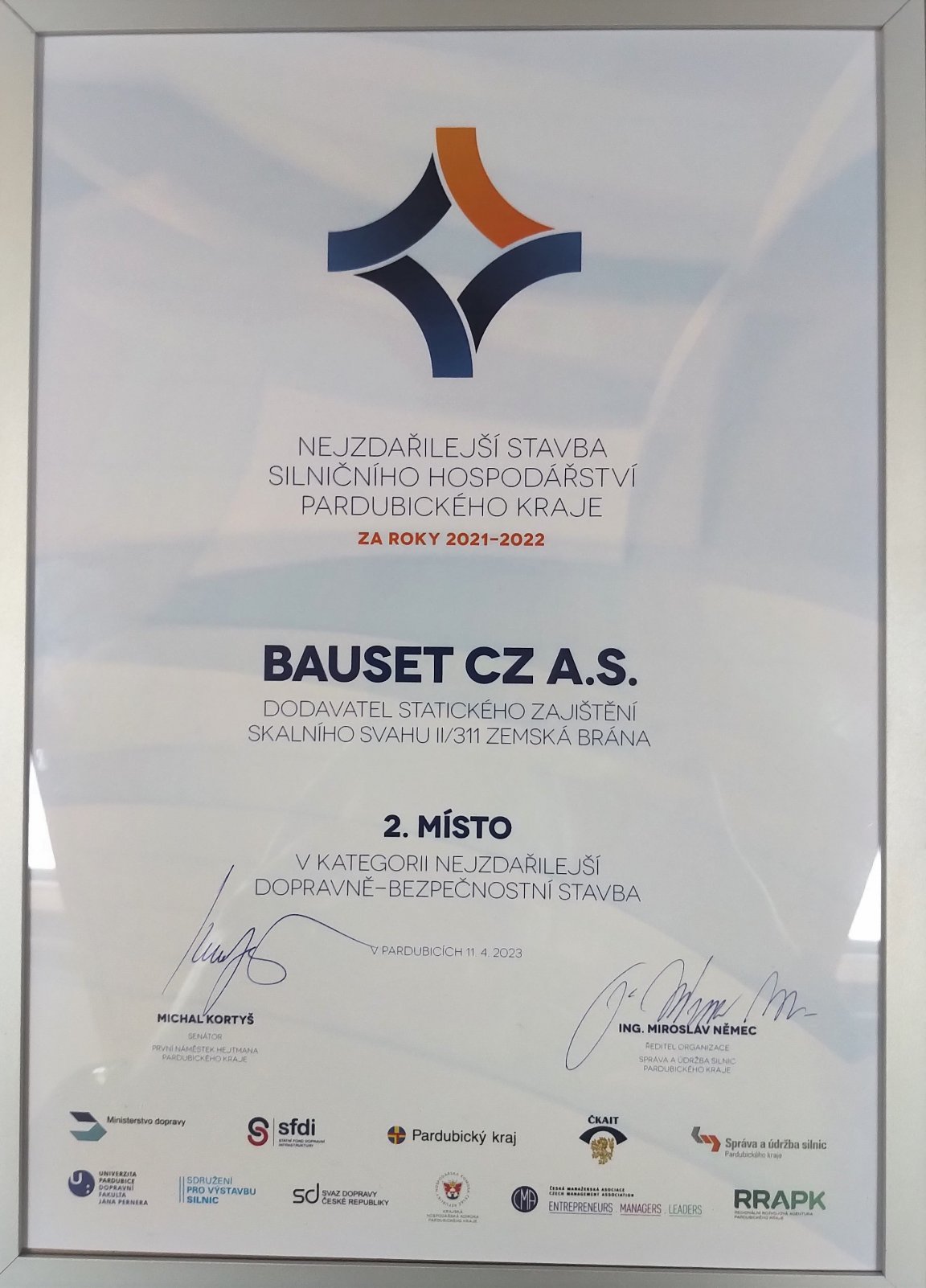 Jako dodavatel jsem byli oceněni za provedení akce "Statické zajištění sklaního masivu II/311 Zemská brána"