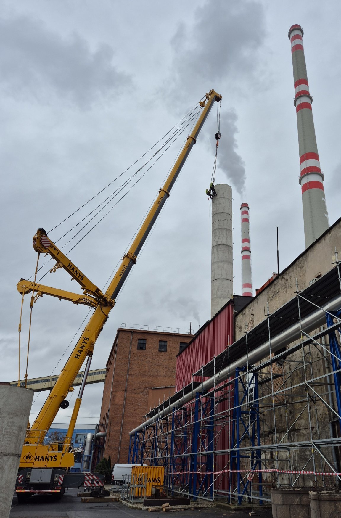 Odstranění železobetonového komína o výšce 66 m při zachováním objektu a jeho funkčních technologií v 1.PP.